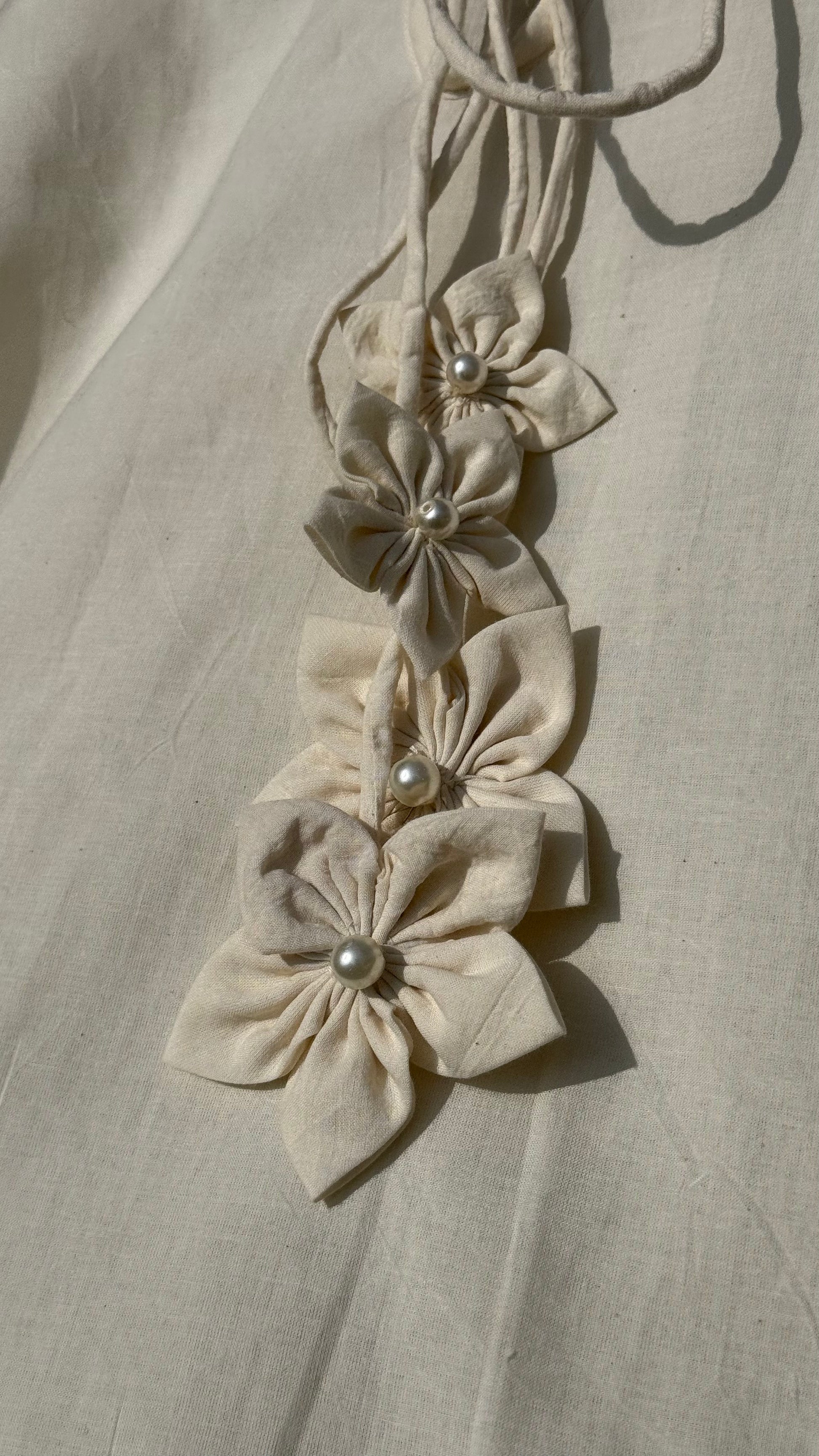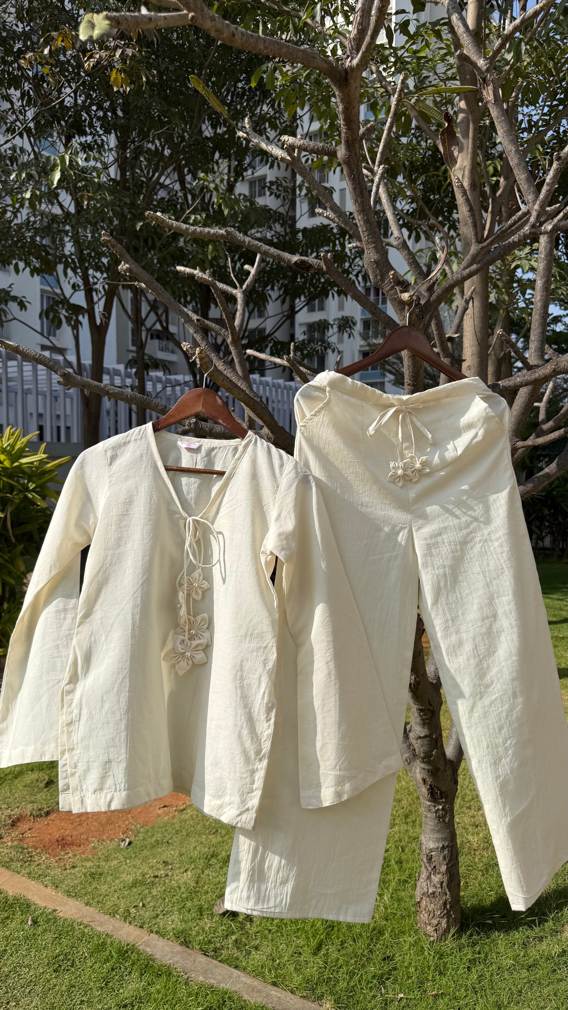 A breathable cotton linen clothing piece designed for effortless comfort and quiet elegance. The full-sleeve top features gentle bell-shaped cuffs and a soft front tie-up, finished with dainty linen flower tassels adorned with a single pearl at the centre. Paired with an airy pyjama-style bottom, this cream-ivory set drapes beautifully on the body, making it an easy choice for slow mornings, sun-washed afternoons, and warm summer evenings.