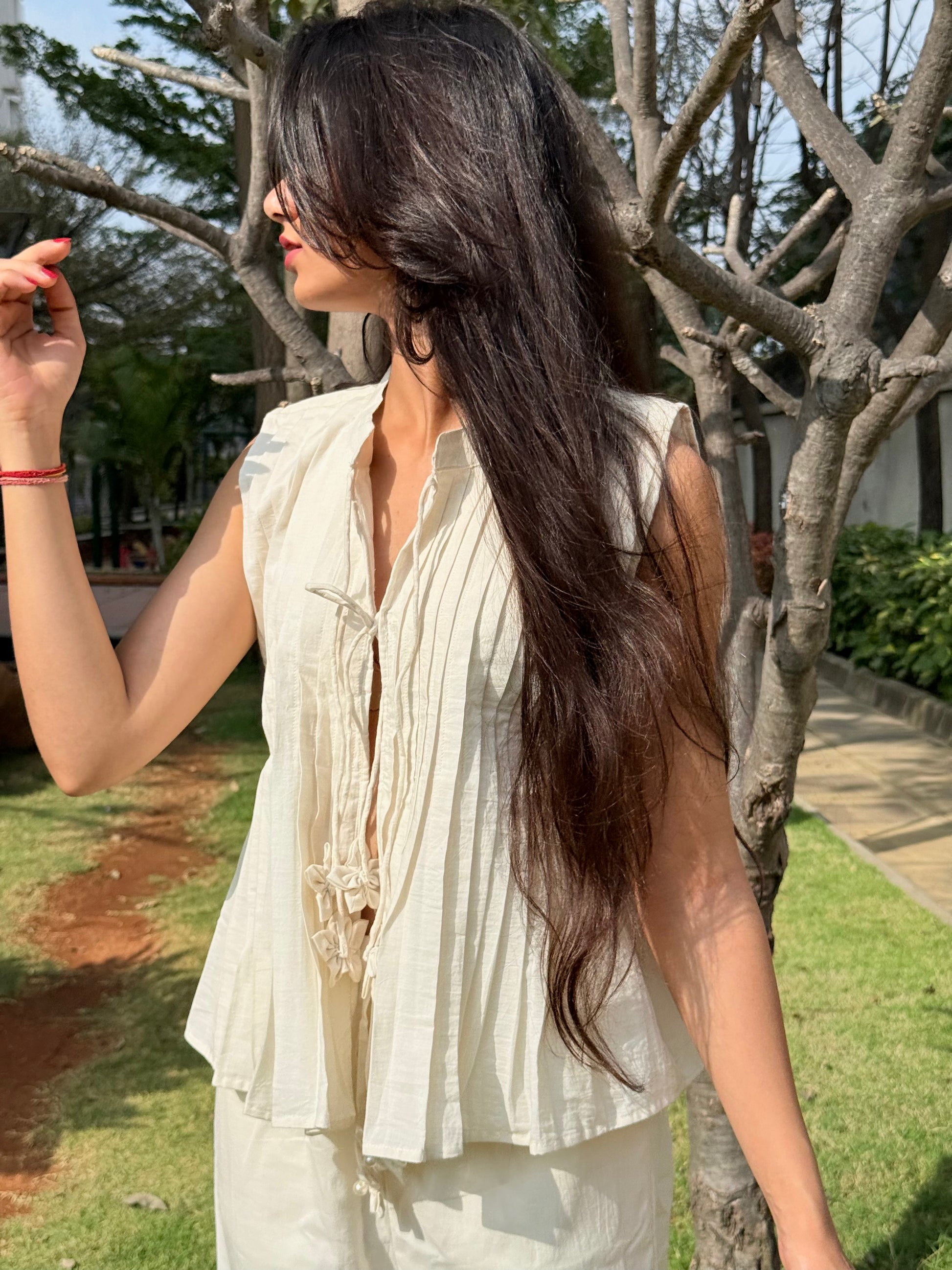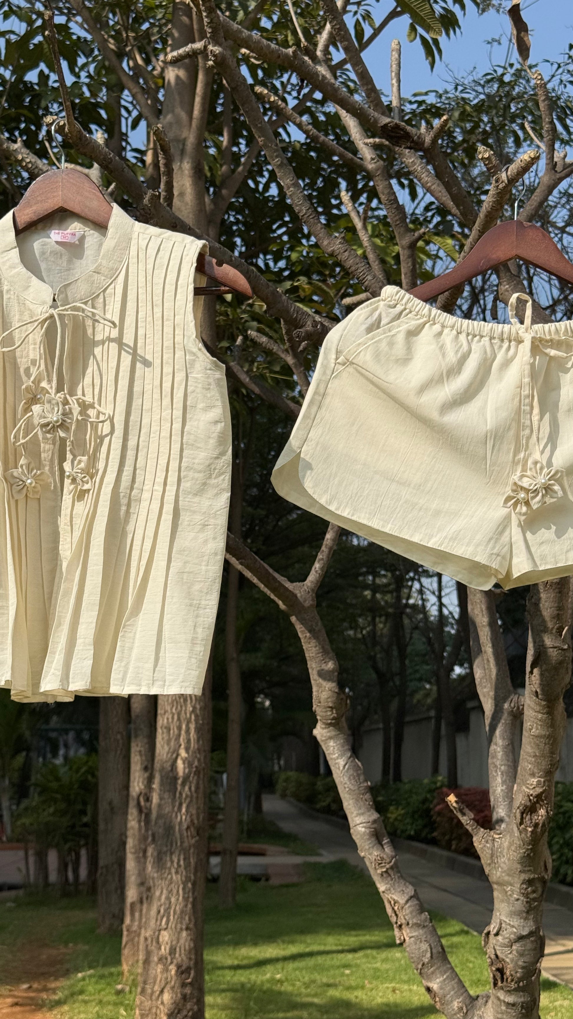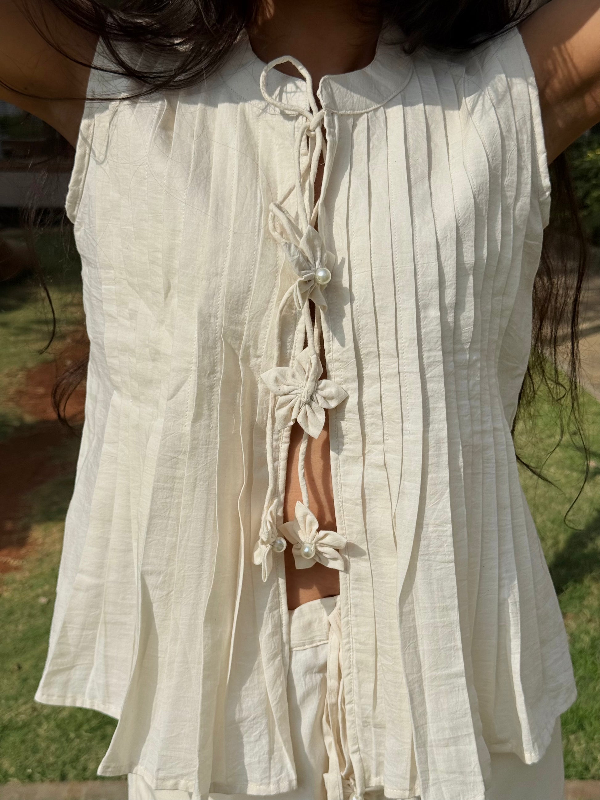 An effortless cotton linen top with a fluid fit and clean lines. The front-pleated top is detailed with three soft tie-ups, finished with linen flower tassels and a pearl centre. Paired with an airy pyjama-style bottom, this cream-ivory set drapes beautifully on the body, crafted in breathable linen and cut for comfort, this cream-toned set offers understated elegance for warm-weather lounging.